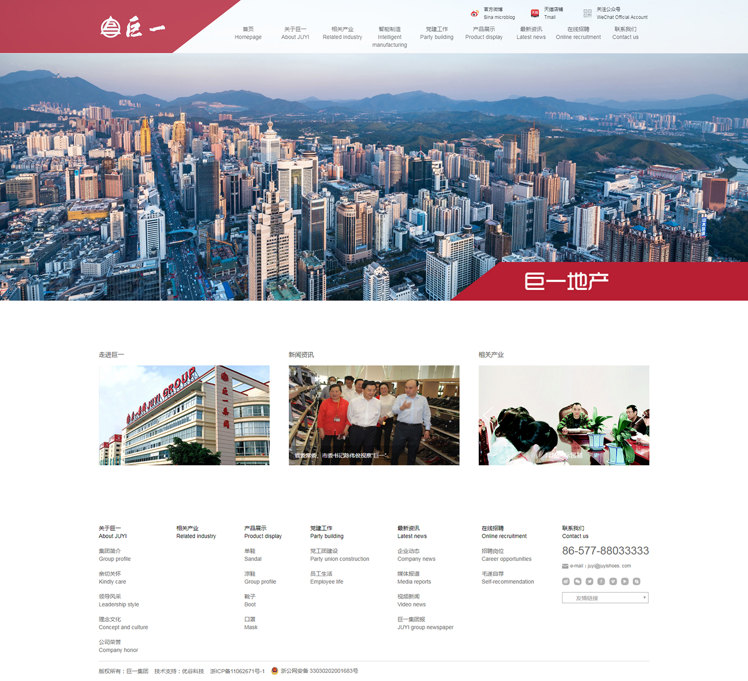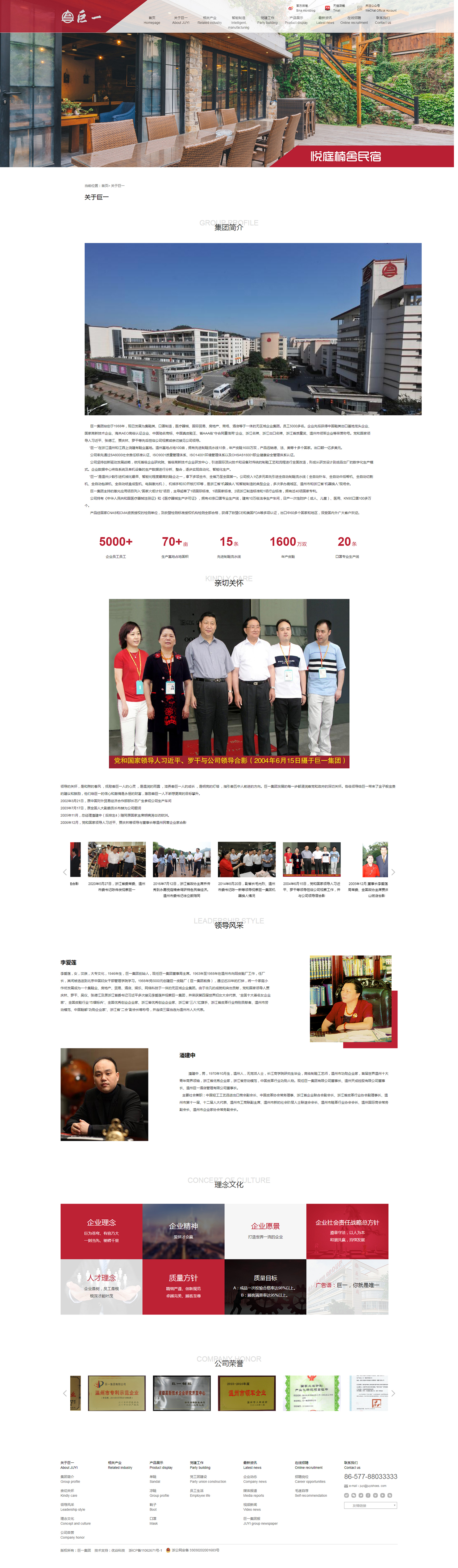 巨一集團(tuán)始創(chuàng)于1988年,現(xiàn)已發(fā)展為集鞋類、口罩制造,醫(yī)療器械、國際貿(mào)易、房地產(chǎn)、商場、酒店等于一體的無區(qū)域企業(yè)集團(tuán)。員工5000多名。企業(yè)先后獲得中國鞋類出口基地龍頭企業(yè)、國家高新技術(shù)企業(yè)、海關(guān)AEO高級認(rèn)證企業(yè)、中國馳名商標(biāo)、中國真皮鞋王、省AAA級“守合同重信用”企業(yè)、浙江名牌、浙江出口名牌、浙江省質(zhì)量獎(jiǎng)、溫州市領(lǐng)軍企業(yè)等榮譽(yù)稱號。黨和國家領(lǐng)導(dǎo)人習(xí)近平、張德江、賈慶林、羅干等先后蒞臨公司視察或親切接見公司領(lǐng)導(dǎo)。